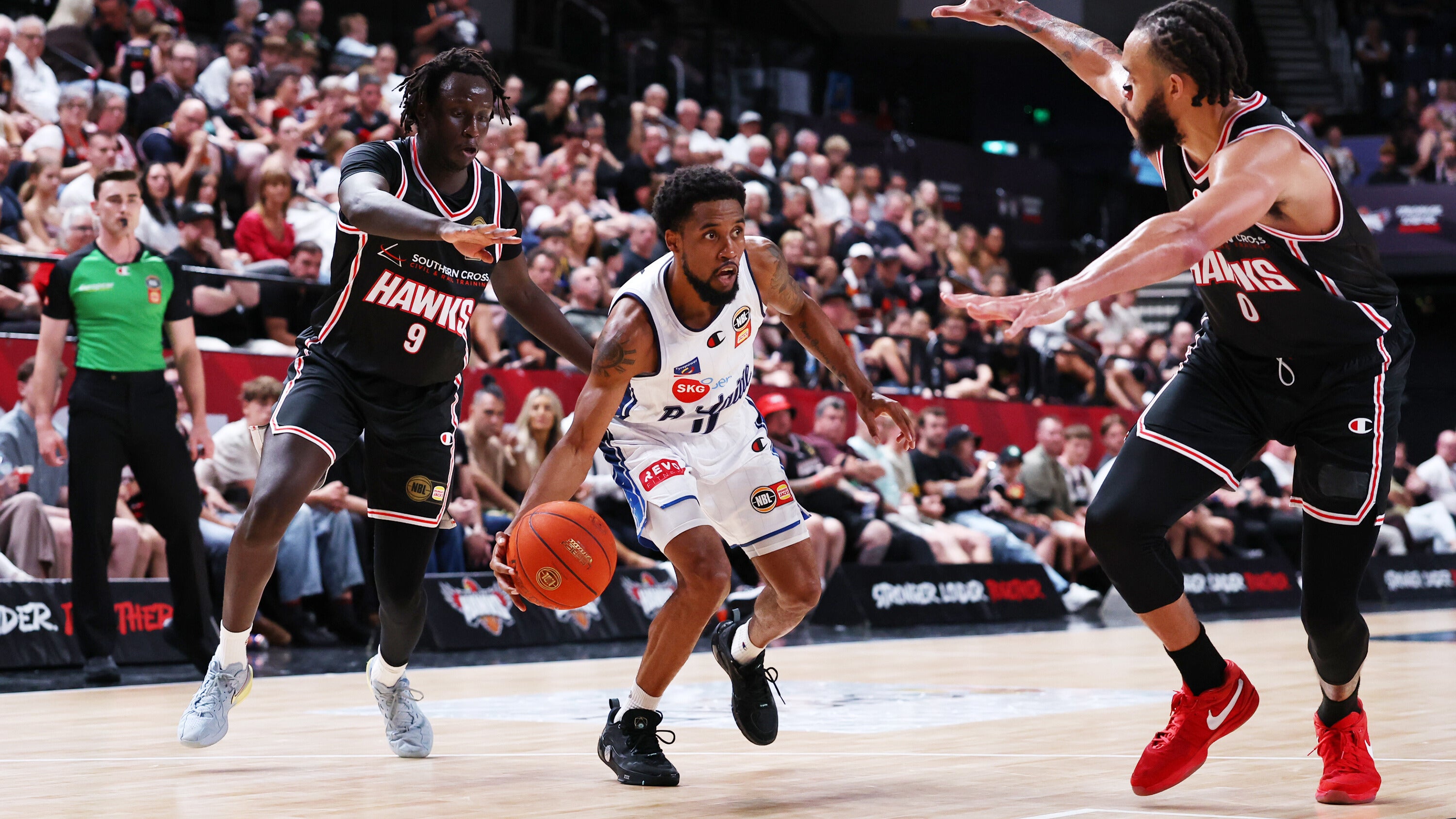 Back from suspension, Nick Rakocevic was proving tough to guard for the Hawks, hitting 10 first-half points as well as pulling down six rebounds, while Zylan Cheatham added six rebounds and six assists to his six points for the half.